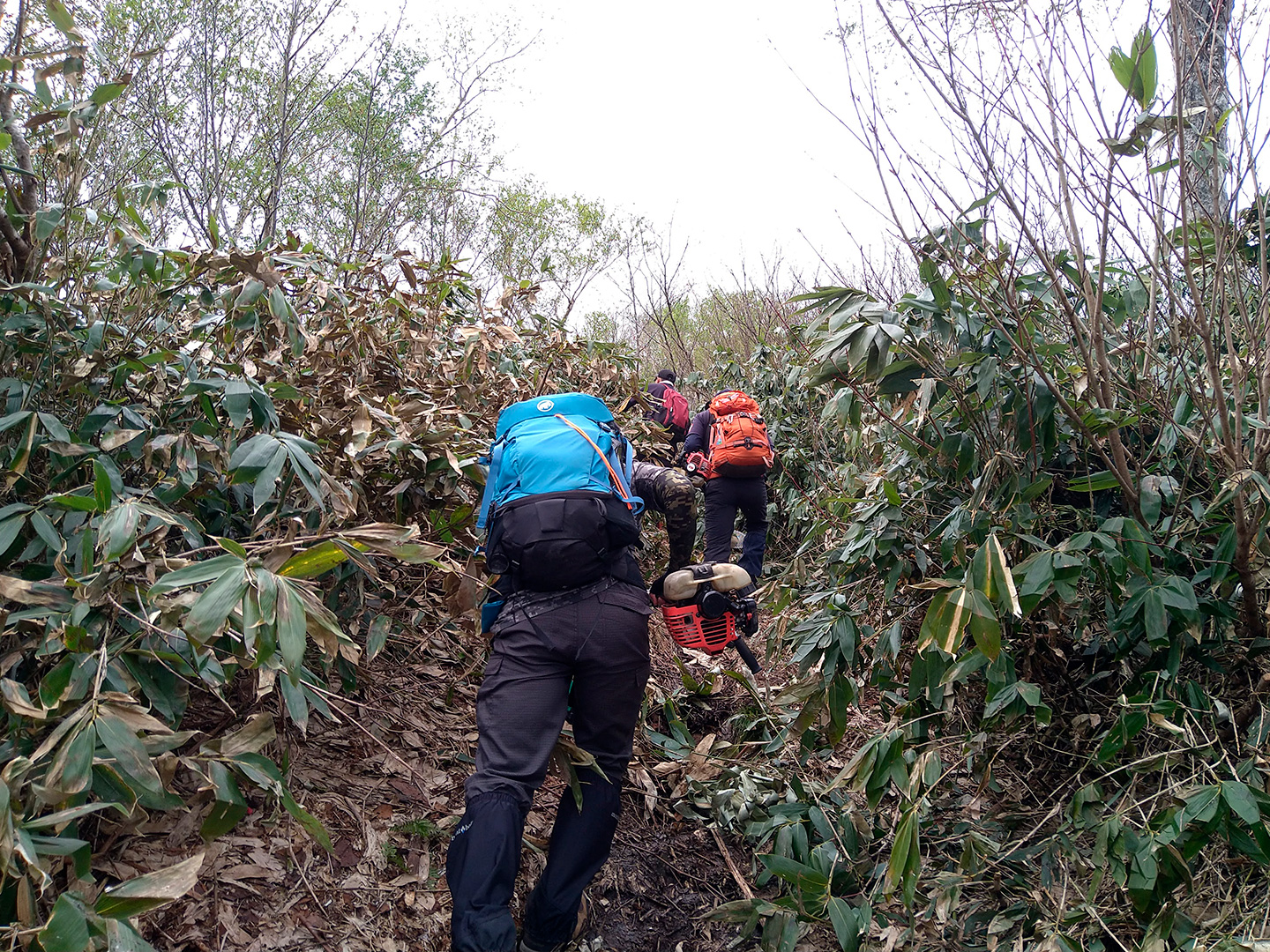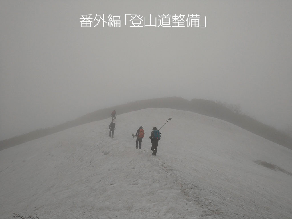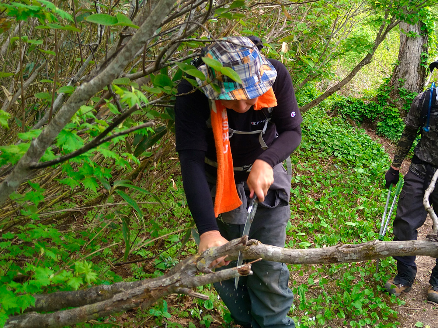 整備の参加者は、町山岳部、役場、観光協会。整備にはブラシカッターや手鋸、枝切りハサミを使用し、伸びた雑草や、雪で曲がって登山道に被った笹や枝を取り払うなどの作業を行いました。