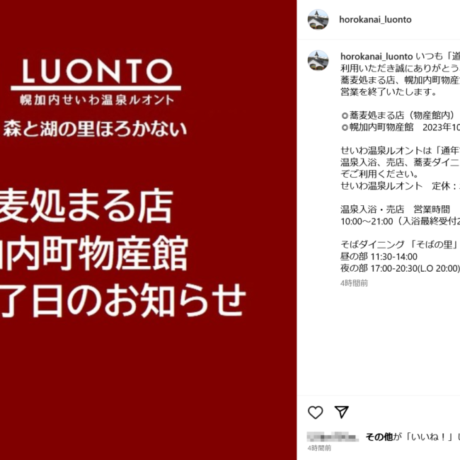2023年10月7日 / Last updated : 2023年10月7日 幌加内町観光協会 道の駅物産館・玄蕎麦処○(まる)2023年の営業終了日程のお知らせ 道の駅「森と湖の里ほろかない」にある物産館及び物産館内のそば店については、下記の日程にて今期の営業が終了いたします。 玄蕎麦処まる店(物産館内) 2023年10月11日(水) 幌加内町物産館 2023年10月29日(日) […]