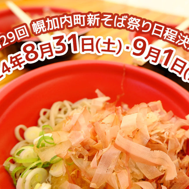 2024年5月25日 / Last updated : 2024年5月25日 幌加内町観光協会 第29回幌加内町新そば祭り日程決定 2024年に開催予定の「第29回幌加内町新そば祭り」の日程が決定いたしました。2024年8月31日(土)・9月1日(日)の2日間となります。詳細については、決定次第改めてお知らせいたします。