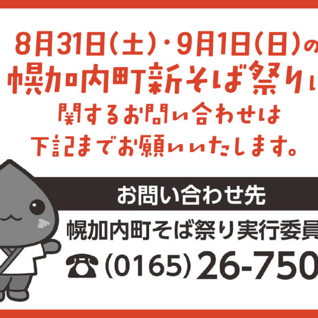 2024年8月30日 / Last updated : 2024年8月28日 幌加内町観光協会 新そば祭りに関するお問い合わせ先 8月31日(土)・9月1日(日)の「幌加内町新そば祭り」に関しては、そば祭り実行委員会へ直接お問い合わせいただけますようよろしくお願いいたします。 幌加内町そば祭り実行委員会0165-26-7505