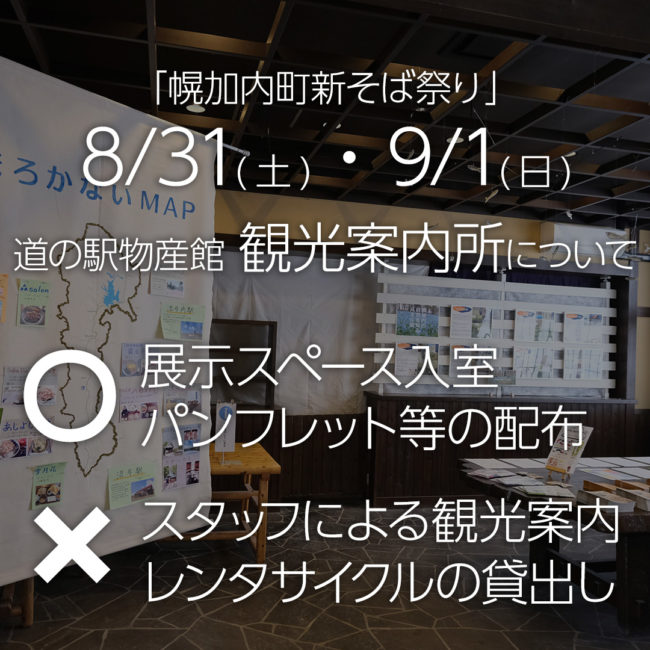 2024年8月23日 / Last updated : 2024年8月23日 幌加内町観光協会 2024年新そば祭り開催両日は観光案内所はお休みです 8月31日(土)・9月1日(日)の「幌加内町新そば祭り」開催両日は、道の駅物産館での観光案内所はお休みとなります。 スタッフによる観光案内、およびレンタサイクルの貸出はお休みですが、展示スペース、およびパンフレット等の配 […]