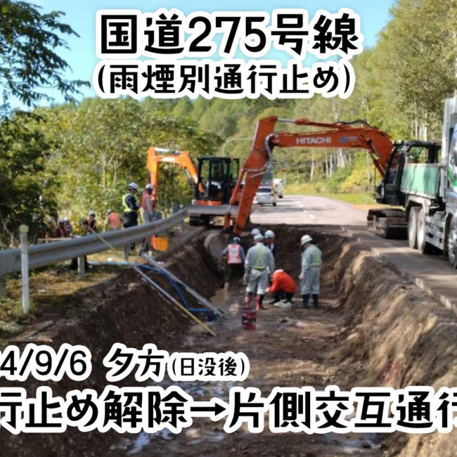 2024年9月6日 / Last updated : 2024年9月6日 幌加内町観光協会 国道275号線通行止め本日(9/6)中に片側交互通行へ 国道275号線雨煙別の通行止めは、本日(9/6)中に片側交互通行となり、通行止めは解除になる予定です。 通行止め解除後についても片側交互通行となりますので、通行の際は誘導に従い、気をつけてご通行ください。