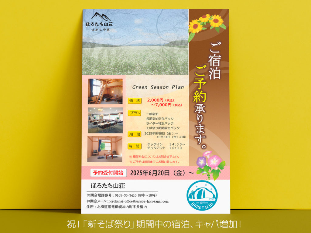 ほろたち山荘はスキー場の宿泊施設として冬季限定での営業となっておりましたが、今年から夏季の営業が始まり、新そば祭り開催時のご宿泊先の選択肢が増えました!