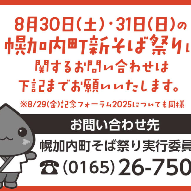 2025年8月5日 / Last updated : 2025年8月5日 幌加内町観光協会 新そば祭りに関するお問い合わせ先 8月30日(土)・31日(日)の「幌加内町新そば祭り」に関しては、そば祭り実行委員会へ直接お問い合わせいただけますようよろしくお願いいたします。8/29(金)の記念フォーラムについても同様となります。
