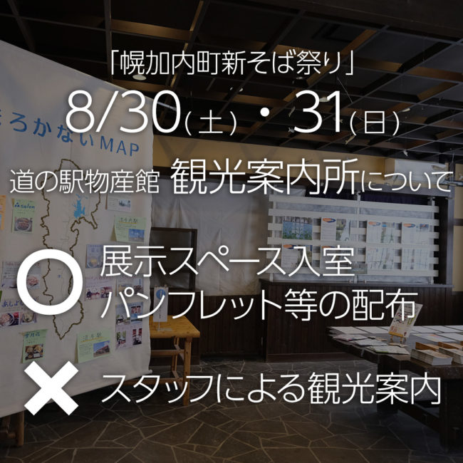 2025年8月8日 / Last updated : 2025年8月8日 幌加内町観光協会 観光案内所 スタッフ不在のお知らせ(8/30-31) 8月30日(土)・31日(日)は、幌加内町新そば祭り開催のため、道の駅物産館でのスタッフによる観光案内はお休みとなります。 スタッフによる観光案内はお休みですが、展示スペース、およびパンフレット等の配布に関しては、ご自由 […]