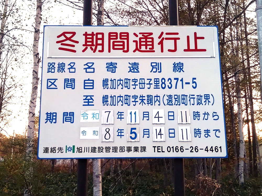 2025年10月15日 / Last updated : 2025年10月15日 幌加内町観光協会 道道688号線 名寄遠別線 冬期間通行止めのお知らせ 道道688号線母子里ゲートより蕗の台方面は、下記の期間通行止めとなります。 2025年(令和7年)11月4日(火)11:00より2026年(令和8年)5月14日(木)11:00まで ご通行の際は、日時をご確認の程よろしくお願いいたします。 FacebookXBluesky