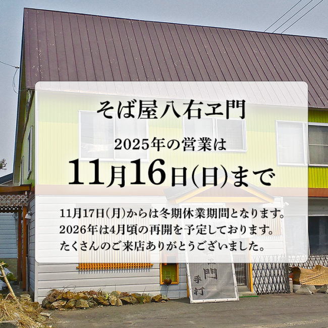 2025年11月11日 / Last updated : 2025年11月11日 幌加内町観光協会 そば屋八右ヱ門 2025年の営業は11/16まで 「そば屋八右ヱ門」は11月16日(日)が今年の最終営業日となります。11月17日(月)からは冬期休業期間に入り、2026年は4月頃の再開を予定しています。たくさんのご利用ありがとうございました。 2025/11/11(火 […]