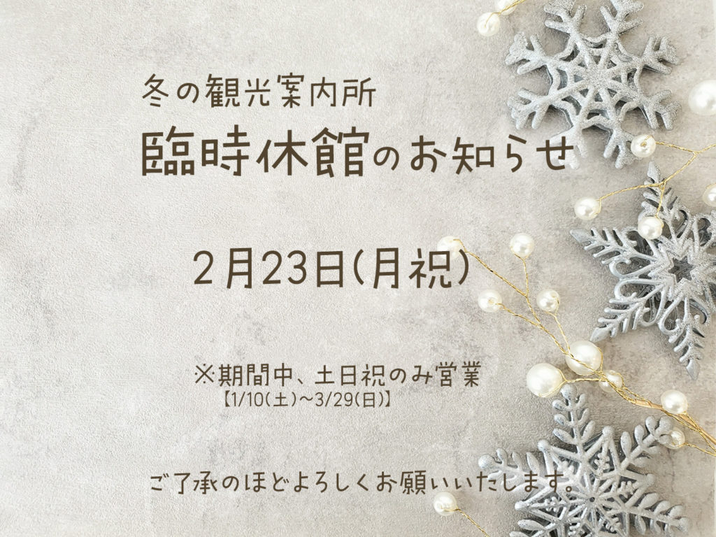 2026年2月22日 / Last updated : 2026年2月22日 幌加内町観光協会 冬の観光案内所 臨時休館のお知らせ(2/23) 幌加内町交流プラザにて開催中の「冬の観光案内所」は、2026年2月23日(月祝) 臨時休館となります。何卒ご了承のほどよろしくお願いいたします。 深名線資料館についても、同様に閉館となりますのでご理解のほどよろしくお願いいたします。 FacebookXBluesky