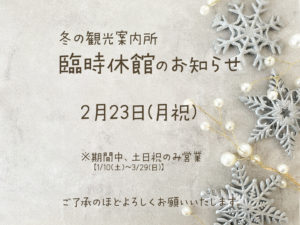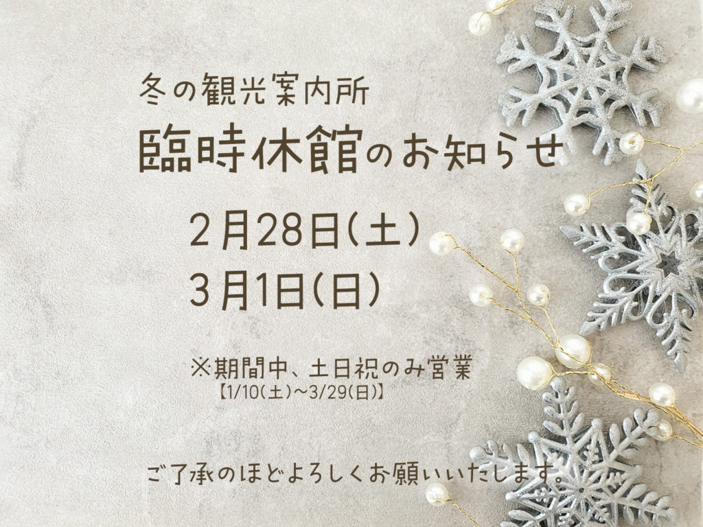 2026年2月27日 / Last updated : 2026年2月27日 幌加内町観光協会 冬の観光案内所 臨時休館のお知らせ(2/28-3/1) 急なお知らせとなってしまい誠に申し訳ございませんが、やむを得ない事情により、幌加内町交流プラザにて開催中の「冬の観光案内所」は、2026年2月28日(土)・3月1日(日)の2日間、臨時休館となります。何卒ご理解・ご了承のほどよろしくお願いいたします。 深名線資料館についても、同様に閉館となりますのでご理解のほどよろしくお願いいたします。 FacebookXBluesky